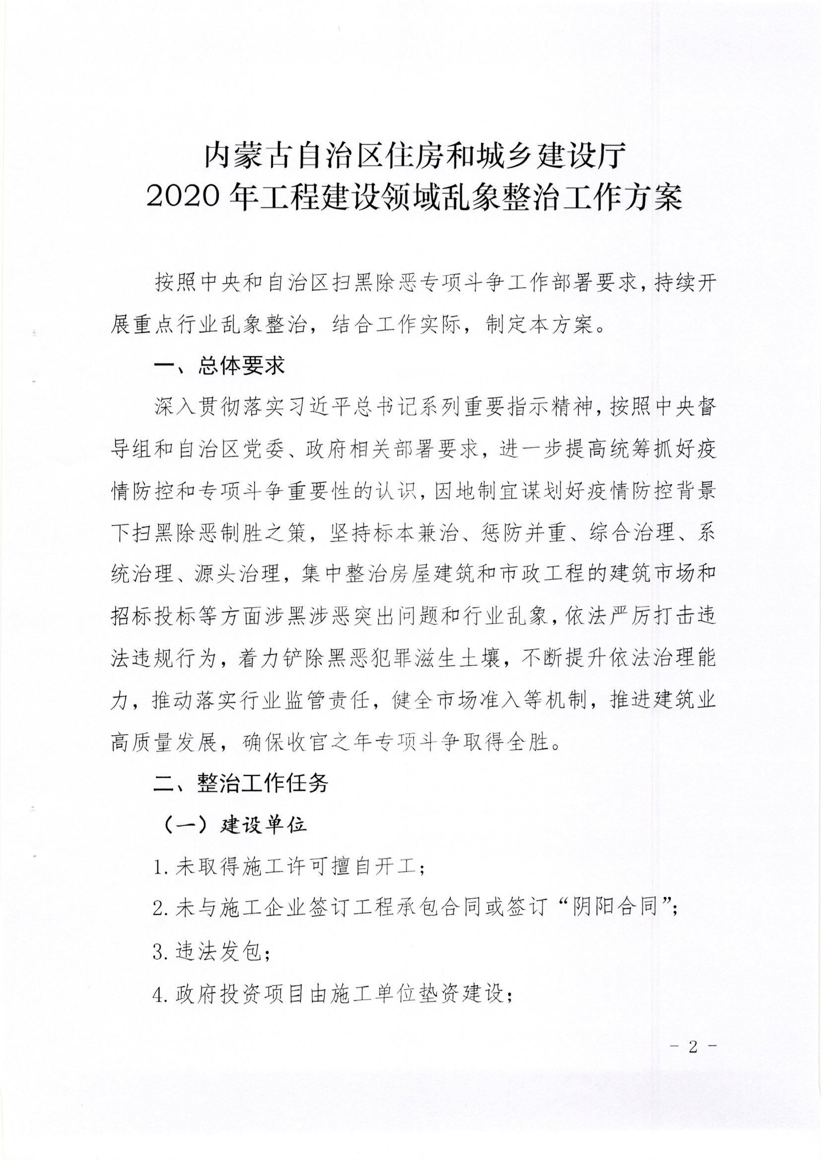關(guān)于印發(fā)《內(nèi)蒙古自治區(qū)住房和城鄉(xiāng)建設(shè)廳2020年工程建設(shè)領(lǐng)域亂象整治工作方案》的通知