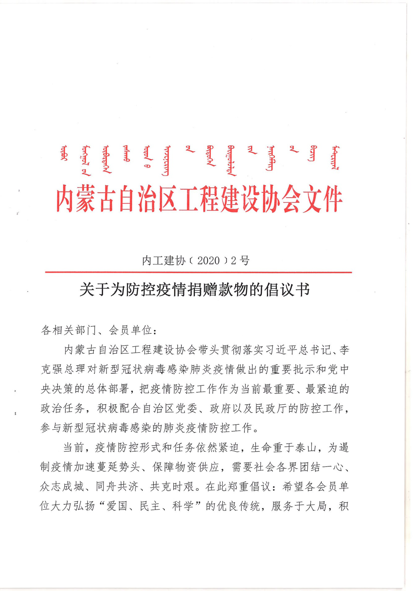 一、1月29日發(fā)出《內(nèi)蒙古自治區(qū)工程建設(shè)協(xié)會關(guān)于疫情防控的倡議書》。